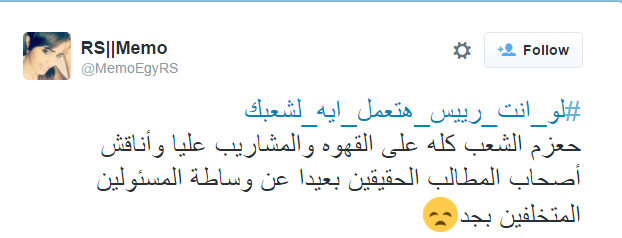 بينما أكد Memo “حعزم الشعب كله على القهوة والمشاريب عليا، وأناقش أصحاب المطالب الحقيقيين بعيدًا عن وساطة المسؤولين المتخلفين بجد”.