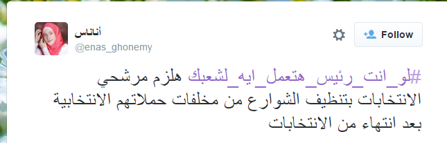 فيما أكدت enas ghonemy أنها ستلزم مرشحي الانتخابات بتنظيف الشوارع من مخلفات حملاتهم الانتخابية بعد انتهاء من الانتخابات.