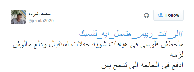 دشن مغردون عبر موقع التواصل الاجتماعي “تويتر”، هاشتاج #لو_انت_رييس_هتعمل_ايه_لشعبك، والذي دخل ضمن قائمة الأعلى تداولًا لدى “تويتر”، عرضوا خلاله ما ينوون فعله للشعب إذا كان أحدهم رئيسًا.