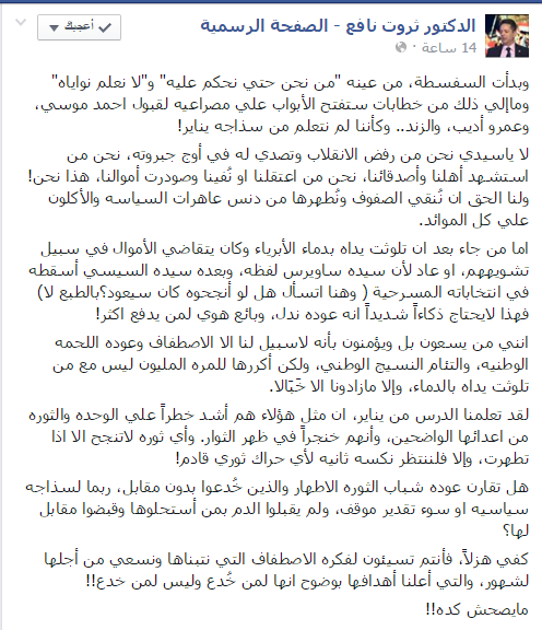 وأضاف “نافع”: “لا يا سيدي نحن من رفض الانقلاب وتصدى له في أوج جبروته، نحن من استشهد أهلنا وأصدقاؤنا، نحن من اعتقلنا أو نُفينا وصودرت أموالنا، هذا نحن! ولنا الحق أن نُنقي الصفوف ونُطهرها من دنس عاهرات السياسة والآكلون على كل الموائد“.