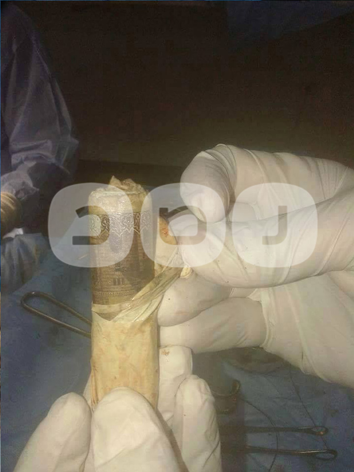 وقام الأطباء بإجراء عملية فتح المعدة، لاستخراج الجسم، ليفاجئوا بأن الجسم عبارة عن لفة من الأموال قيمتها 1000 جنيه.