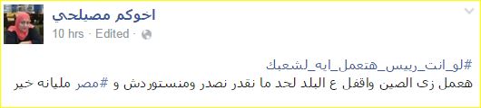 بينما قالت “أخوكم مصيلحي”: “هعمل زي الصين وأقفل ع البلد لحد ما نقدر نصدر ومانستوردش ومصر مليانة خير”.