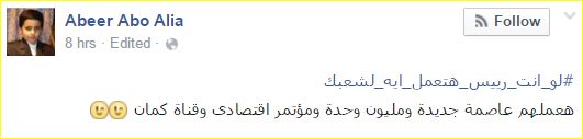 وسخرت عبير أبو عاليا: “هعملهم عاصمة جديدة ومليون وحدة ومؤتمر اقتصادي”.