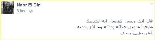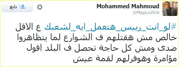 في البداية كتّب المدون “شٍأّګر شٍأّګر ♏”: “هعمل زي السيسي ما عمل في رابعة والنهضة، هجيب كل المؤيدين للسيسي من الإعلاميين ورجال الأعمال والأزهر والأحزاب”.