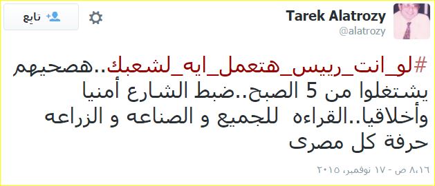 وعلق طارق العتروزي: “هصحيهم يشتغلوا من 5 الصبح.. ضبط الشارع أمنيا وأخلاقيا.. القراءة للجميع والصناعة والزراعة حرفة كل مصري”.