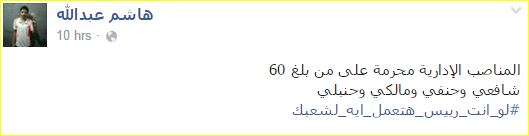 واقترح هاشم عبد الله أن يمنع من تعدى الـ60 من تولي المناصب الإدارية بالدولة.