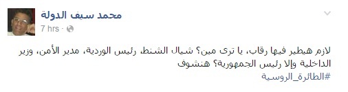 وكتب “سيف الدولة” منشورا عبر صفحته الرسمية على موقع “فيس بوك” قال فيه: “لازم هيطير فيها رقاب، يا ترى مين؟ شيال الشنط، رئيس الوردية، مدير الأمن، وزير الداخلية ولا رئيس الجمهورية؟ هنشوف، #الطائرة الروسية”.