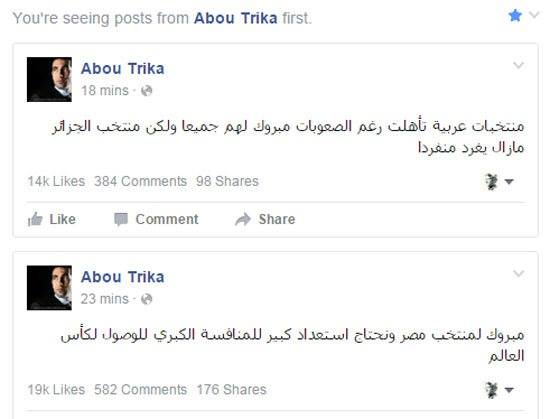 أبدى محمد أبو تريكة، لاعب الأهلي المعتزل، سعادته البالغة بتأهل منتخب مصر إلى المرحلة النهائية من التصفيات المؤهلة إلى مونديال روسيا 2018.