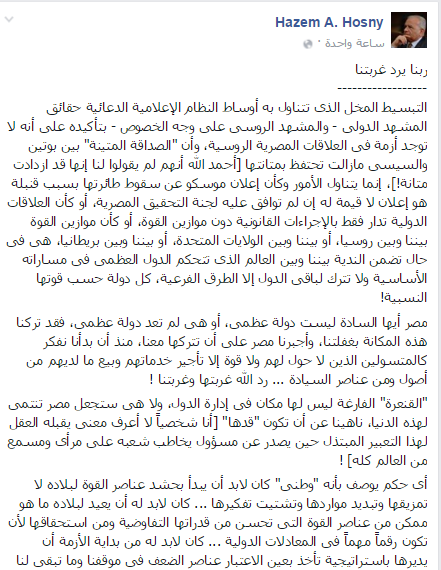 استنكر حازم حسني إدارة السلطات المصرية لأزمة الطائرة الروسية وتناول الأوساط الإعلامية للمشهد الدولي، والتأكيد أن العلاقات المصرية الروسية لا زالت تحتفظ بمكانتها.