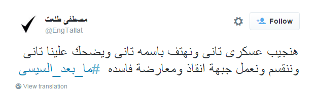 وكتب مصطفى طلعت: “هنجيب عسكري تاني ونهتف باسمه تاني ويضحك علينا تاني وننقسم ونعمل جبهة إنقاذ ومعارضة فاسدة”.