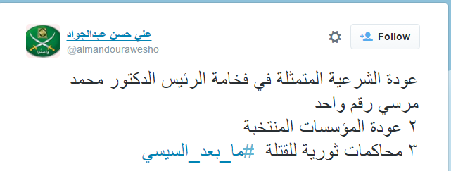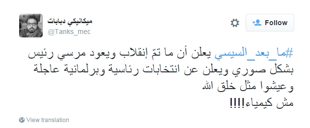 ويقول Tanks_mec: “يعلن أن ما تمّ انقلاب ويعود مرسي رئيس بشكل صوري ويعلن عن انتخابات رئاسية وبرلمانية عاجلة.. وعيشوا مثل خلق الله”.