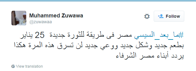 وتوقع Muhammed Zuwawa أن مصر بعد السيسي “في طريقها لثورة جديدة 25 يناير بطعم جديد وشكل جديد ووعي جديد لن تسرق هذه المرة هكذا يردد أبناء مصر الشرفاء”.