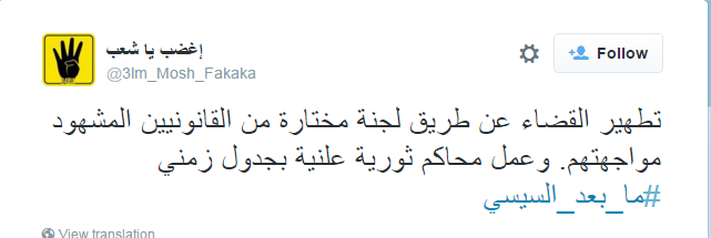 بينما رأى ‏lm_Mosh_Fakaka أنه يجب أن يتم “تطهير القضاء عن طريق لجنة مختارة من القانونيين المشهود مواجهتهم. وعمل محاكم ثورية علنية بجدول زمني”.