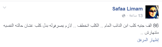 وسخرت Safaa Limam قائلة: “86 ألف جنيه كلب ابن النائب العام.. الكلب اتخطف.. لازم يصرفوله بدل كلب عشان حالته النفسيه متنهارش”.