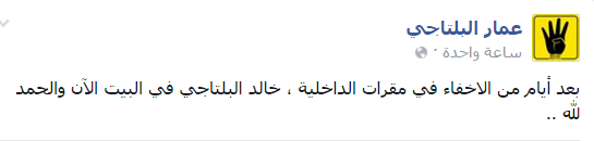 وقال -عبر منشور له على “فيس بوك”-: “بعد أيام من الإخفاء في مقرات الداخلية، خالد البلتاجي في البيت الآن والحمد لله”.
