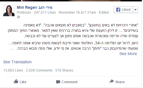 أعلنت وزيرة الثقافة والرياضة “الإسرائيلية” والنائب عن حزب “الليكود”، ميري ريجيف، على صفحتها الخاصة في موقع “فيس بوك”، عن رغبتها في عريس مناسب، للمساعدة التي تعمل معها.