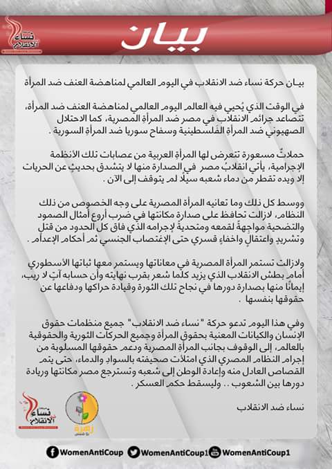 نشرت حركة نساء ضد الانقلاب المناهضة لحكم العسكر بيانًا تدين فيه ممارسات النظام وقوات الأمن من اعتقالات واعتداءات، فضلاً عن التحرش بالسيدات المصريات، خاصةً المعارضات لحكم العسكر، وذلك بمناسبة اليوم العالمي لمناهضة العنف ضد المرأة.