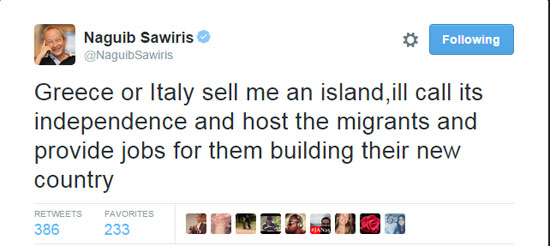 وعرض ساويرس، الذي يعد واحدا من أغنى رجال الأعمال المصريين، في بداية سبتمبر على “تويتر” شراء جزيرة في اليونان أو إيطاليا لإعلان استقلالها واستقبال اللاجئين وتوفير وظائف لهم في ما سماه “بلدهم الجديد”.