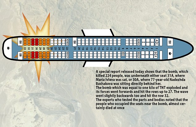 ويعتقد المحققون أن “ماريا” هي من أول من ماتت في الحادث؛ حيث يعتقد الخبراء أن القنبلة وضعت تحت الكرسي رقم” 31 ايه” الذي كانت تجلس عليه أو “30 آية”، وهو الكرسي المخصص لوالدتها “نادزدا باشاكوفا” البالغة من العمر 44 عامًا التي كانت تجلس بجوارها.