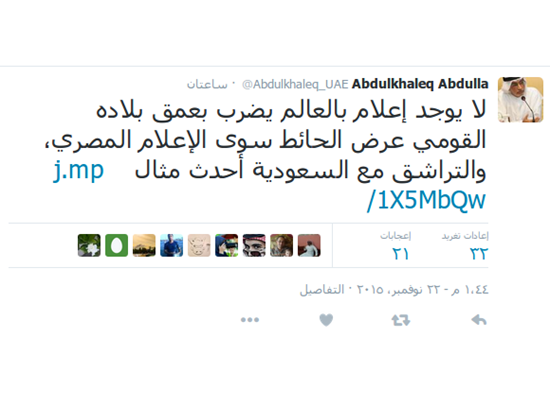 وأضاف “عبدالله” فى تغريدة له عبر صفحته الشخصية على موقع التواصل الاجتماعي “تويتر”: “لا يوجد إعلام بالعالم يضرب بعمق بلاده القومي عرض الحائط سوى الإعلام المصري، والتراشق مع السعودية أحدث مثال”.