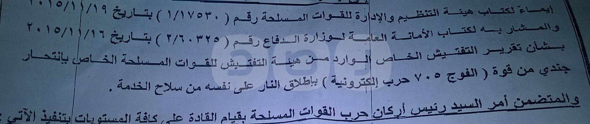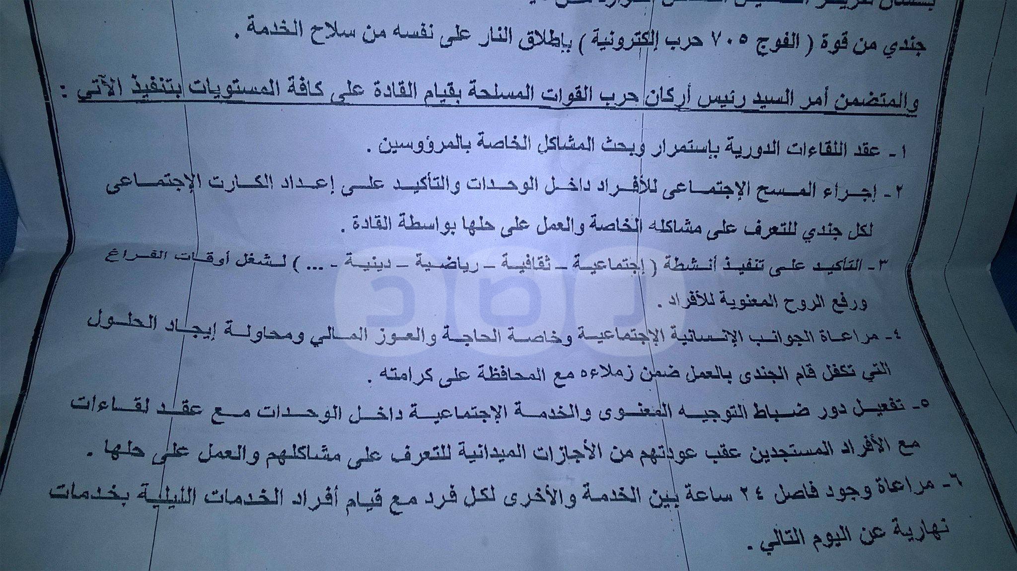 حصلت شبكة “رصد” على وثيقة مسربة من القوات المسلحة المصرية، تحوي أوامر من الفريق محمود حجازي رئيس أركان حرب القوات المسلحة، باتخاذ بعض الإجراءات لحل مشاكل المجندين المصريين، نظرًا لزيادة حالات الانتحار داخل الجيش المصري.