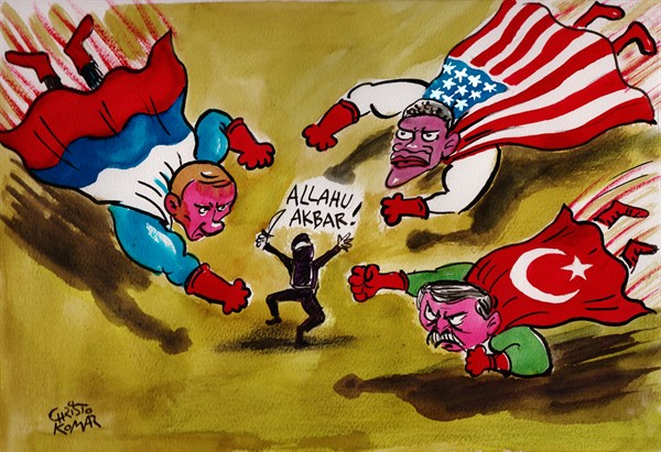وعن محاربة “بوتين” لتنظيم الدولة نشر “بولتيكال كارتونز” هذا الرسم:
