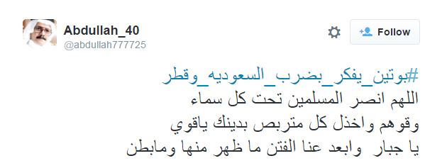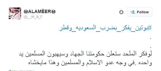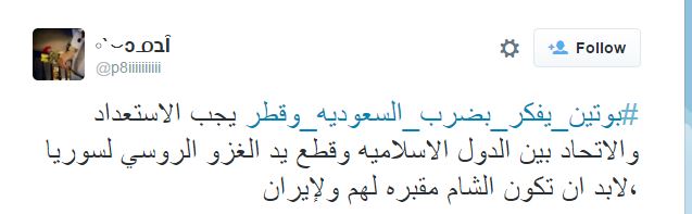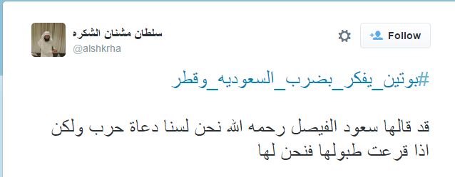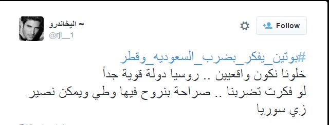 ودشن المغردون هاشتاج ” #بوتين_يفكر_بضرب_السعوديه_وقطر” والذي تصدر قائمة الأعلى لدى “تويتر”، واختلفت ردود الأفعال على تلك التهديدات.