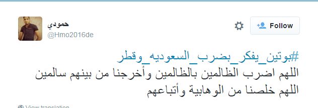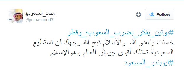 وهاجم محمد المسعود “بوتين” قائلاً: “خسئت يا عدو الله والإسلام قبح الله وجهك لن تستطيع، فالسعودية تمتلك أقوى جيوش العالم وهو الإسلام“.