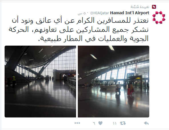 وأضافت: “جميع الرحلات الجوية في مطار حمد الدولي ستغادر وفق مواعيدها الأصلية والحركة الجوية والعمليات في المطار طبيعية.. سنقوم بتزويدكم بالمستجدات”.
