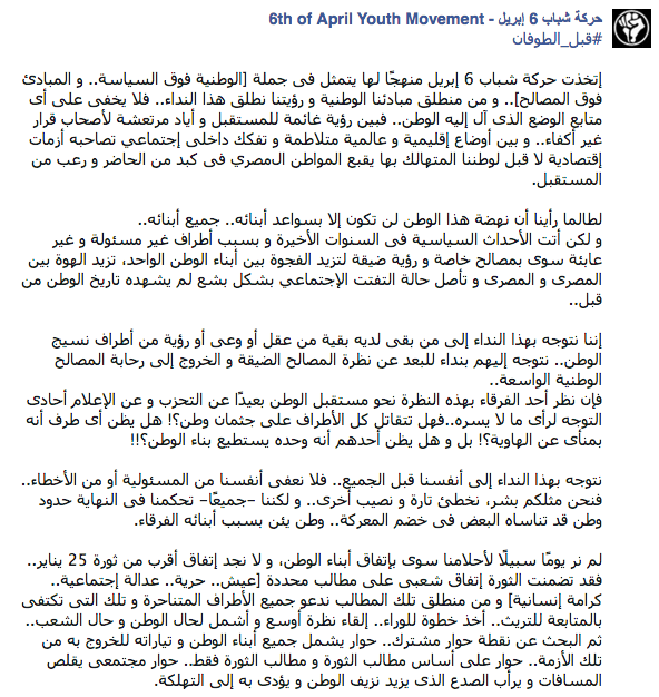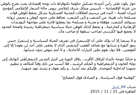 وقالت الحركة في بيان لها على موقع التواصل الاجتماعي “فيس بوك”: إنه لم نر يومًا سبيلًا لأحلامنا سوى باتفاق أبناء الوطن، ولا نجد اتفاقًا أقرب من ثورة 25 يناير، فقد تضمنت الثورة اتفاقًا شعبيًّا على مطالب محددة [عيش.. حرية..عدالة إجتماعية.. كرامة إنسانية].
