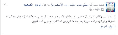وقال أبويس الصعيدي: “أيام مرسي لا كان رشوة ولا محسوبية، فأعلن محمد إبراهيم للداخلية إجازة مفتوحة لعودة السرقة والرشوة والمحسوبية حتى إسقاط الرئيس المنتخب على أيدى الانقلابيين”.