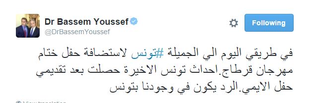 أعلن الإعلامي الساخر باسم يوسف، اعتزامه السفر إلى تونس؛ لتقديم الحفل الختامي لمهرجان قرطاج، مشيرا إلى أن الرد على التفجيرات التي وقعت بتونس يكون بتواجدنا فيها.