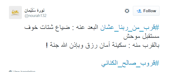 ورأت نورة سُلَيْمان “#قرب_من_ربنا_عشان البعد عنه: ضياع شتات خوف مستقبل موحش، بالقرب منه: سكينة أمان رزق وبإذن الله جنة!”.