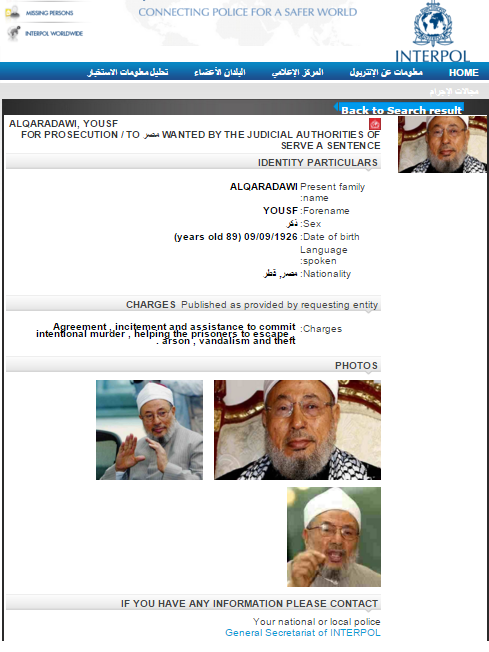 ووضع الإنتربول في الخامس من ديسمبر من العام الماضي نشرة حمراء بحق عدد من قيادات ورموز جماعة الإخوان المسلمين، أبرزهم الشيخ القرضاوي الحامل للجنسيتين المصرية والقطرية، وجاء إصدار تلك النشرة بناءً على طلب من السلطات المصرية.