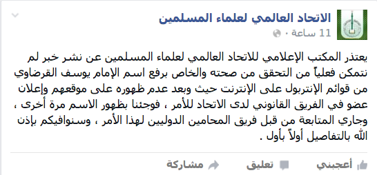 وقالت عدة مواقع إخبارية: إن الاتحاد العالمي لعلماء المسلمين أصدر بيانًا أكد فيه رفع اسم الدكتور القرضاوي من قوائم الترقب، وهو ما نفاه الاتحاد”.
