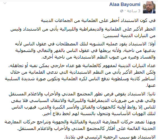 أكد الباحث السياسي، علاء بيومي، أن الخطر الأكبر على العلمانية والديمقراطية والليبرالية، يأتي من الاستبداد، وليس من التيارات الدينية.