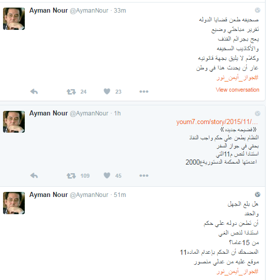 وقال نور: “فضيحة جديدة.. النظام يطعن على حكم واجب النفاذ بحقي في تجديد جواز السفر”.