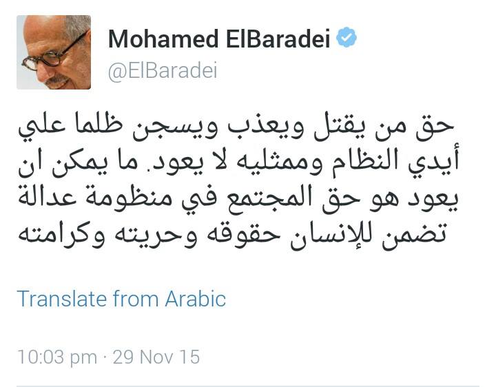 وقال البرادعي في تغريدته: “حق من يُقتل ويُعذب ويُسجن ظلما على أيدي النظام وممثليه لا يعود. ما يمكن أن يعود هو حق المجتمع في منظومة عدالة تضمن للإنسان حقوقه وحريته وكرامته”.