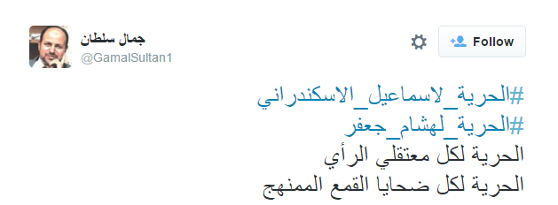 وطالب الكاتب جمال سلطان بالحرية لإسماعيل الإسكندراني، وهشام جعفر، والحرية معتقلي الرأي ولكل ضحايا القمع الممنهج”.