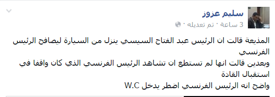 وعلق الكاتب الصحفي سليم عزوز: “المذيعة قالت إن الرئيس عبدالفتاح السيسي ينزل من السيارة ليصافح الرئيس الفرنسي، وبعدين قالت إنها لم تستطع أن تشاهد الرئيس الفرنسي الذي كان واقفًا في استقبال القادة.. واضح أن الرئيس الفرنسي اضطر يدخل W.C“.