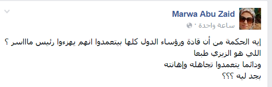 وتقول مروة أبو زيد: “إيه الحكمة من أن قادة ورؤساء الدول كلها بيتعمدوا يهزأوا رئيس ماااسر؟ اللي هو الزيزي طبعًا، ودائمًا يتعمدوا تجاهله وإهانته بجد ليه؟؟؟”.