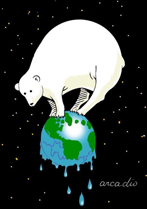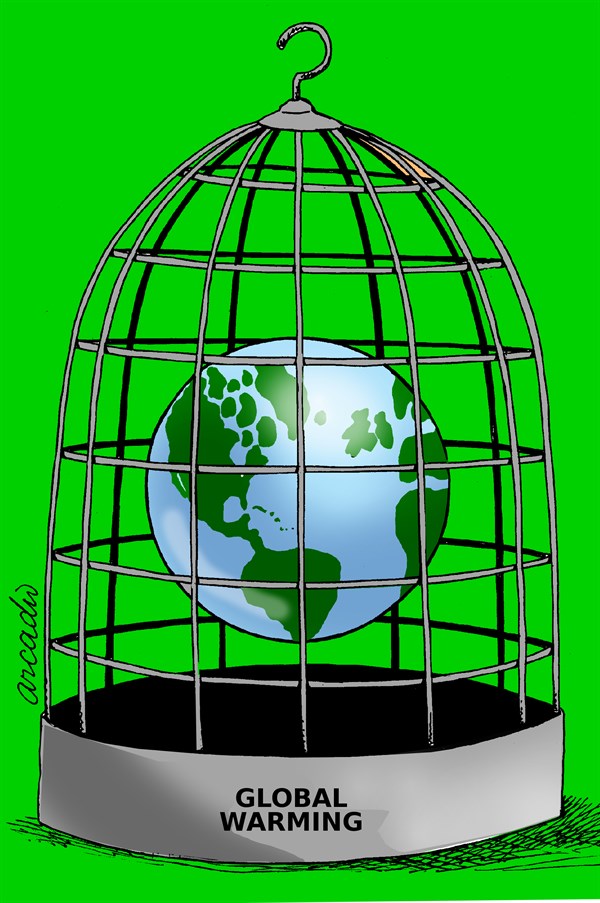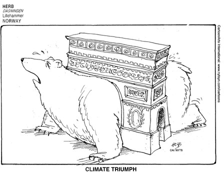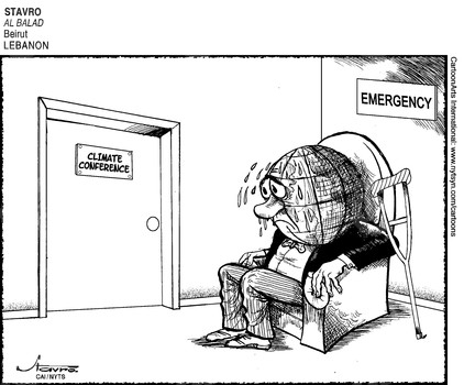 ونبدأ جولة الكاريكاتير من موقع “بولتيكال كارتونز” الذي عرض هذا الرسم تعليقا على مؤتمر المناخ المنعقد في باريس هذه الأيام، حيث حمل الرسم عنوان “حرروا العالم”: