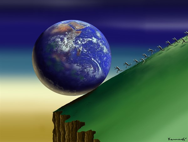 وعبر موقع “كاجل” بهذا الرسم عن رؤيته لوضع العالم الآن، إذ يوضح أن ينحدر بسرعة نحو الهاوية وأن كل محاولات الانهيار فشلت: