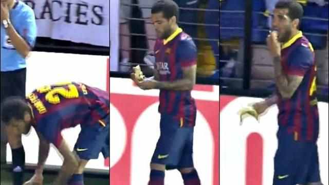 9- في موسم 2012/2013 واجه نادي برشلونة ضيفه فياريال بالدوري الإسباني، وشهدت المباراة واقعة عنصرية للغاية بعدما رمى جماهير فياريال موزة على المدافع البرازيلي صاحب البشرة السمراء “داني الفيس” لاعب النادي الكتالوني، ولكن الغريب في الأمر، وهو أكله نصف الموزة.