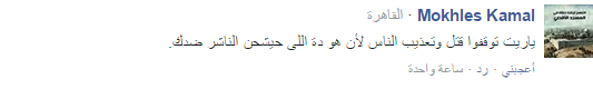 وجه Mokhles Kamal حديثه للداخلية قائلا: “ياريت توقفوا قتل وتعذيب الناس لأن هو دة اللى حيشحن الناشر ضدك”.