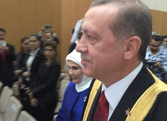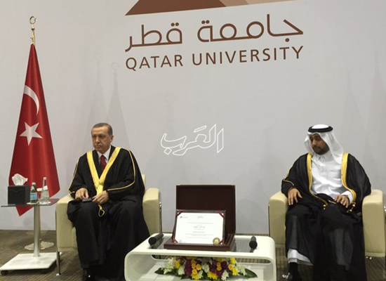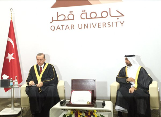 رفع الرئيس التركي، رجب طيب أردوغان، “شارة رابعة”، اليوم الأربعاء، خلال زيارته لجامعة قطر، وذلك قبل إلقاء محاضرة أمام الحضور بالجامعة، ضمن برنامج زيارته للدوحة.