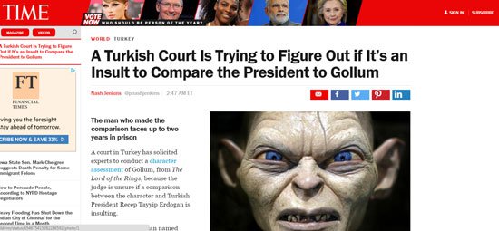 نشر موقع اليوم السابع نقلًا عن مجلة التايم الأميركية أن طبيبا تركيا سيخضع لعقوبة عامين في السجن، لعقده مقارنة بين الرئيس التركي رجب طيب أردوغان، وبين شخصية “جولم” في فيلم “ملك الخواتم” الشهير، مضيفة أن محكمة في تركيا استعانت بخبراء لإجراء تقييم على شخصية “جولم” لأن القاضي ليس متأكدًا من أن المقارنة بين الشخصية الكارتونية والرئيس التركي تعد إهانة.