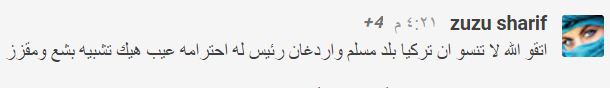 وأوضحت “زوزو أشرف”: “اتقوا الله لا تنسوا أن تركيا بلد مسلم وأردوغان رئيس له احترامه عيب هيك تشبيه بشع ومقزز”.