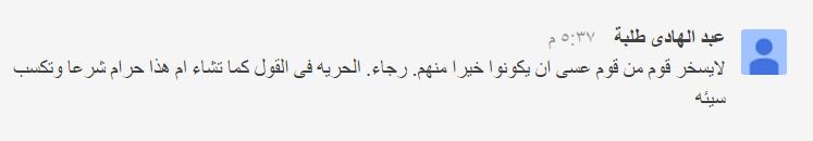 وكتب “عبدالهادي طلبة”: “لا يسخر قوم من قوم عسى أن يكونوا خيرا منهم. رجاء. الحرية في القول كما تشاء أما هذا فحرام شرعا وتكسب سيئة”.