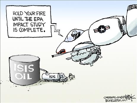 أما عن السعي للقضاء على إمداد تنظيم الدولة بالبترول سخر موقع “تاون هال” بهذا الرسم: